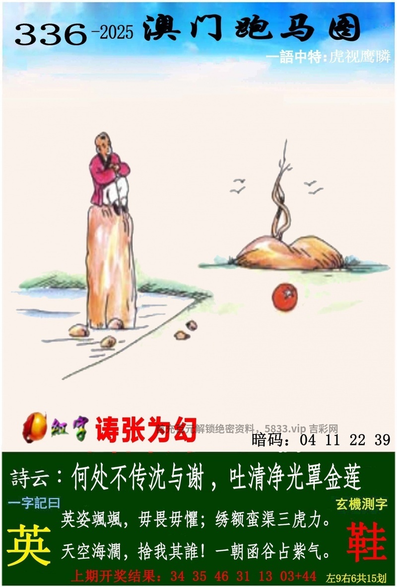 336期:澳门内幕传真 今期生肖三四开,穿金戴银戴兰花。 三七相合是特码,红艰两波发大家。 春风得意发财时,田叶荷花莲藕香。 生意兴隆才禄进,乾坤运转喜事多。 山清水秀 解:今期生肖三四开,穿金戴银戴兰花。三四解猴,金肖猴鸡,三七相合是特码,红艰两波发大家。红波,三七解蛇猴。春风得意发财时,田叶荷花莲藕香。春风肖兔虎龙,生意兴隆才禄进,乾坤运转喜事多。喜事多解吉肖蛇羊鸡龙马兔。 拐特九肖:猴鸡蛇兔虎龙羊马牛 |