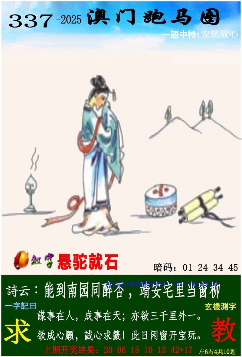 337期:一字記曰【求】 谋事在人,成事在天,亦欲三千里外一。 欲成心原,诚心求签,此日闲窗开宝玩。《教》 解:图片显示一个女子身边有画解出女肖蛇羊鸡猪兔,本期红字带来的是悬驼就石的意思是宰杀骆驼时,磨刀石在哪里,就把骆驼悬挂在哪里。比喻做事违背常理,费力很大而收效甚微诗词的意思是指事情的成功既需人的主动谋划,也受不可控的客观条件影响。其核心内涵强调主观努力与外部机遇的结合,常用于劝诫人们既积极行动又理性看待结果 综合取肖:蛇羊鸡猪兔牛马 |